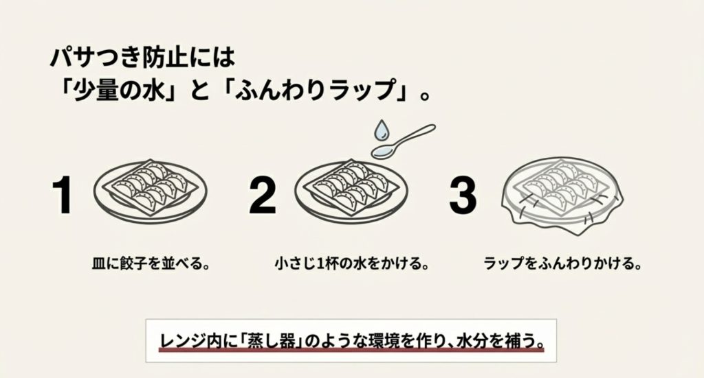 特に、皮が厚めの餃子や、冷蔵庫で長時間保存して乾燥してしまった餃子にはこの方法がベストです。