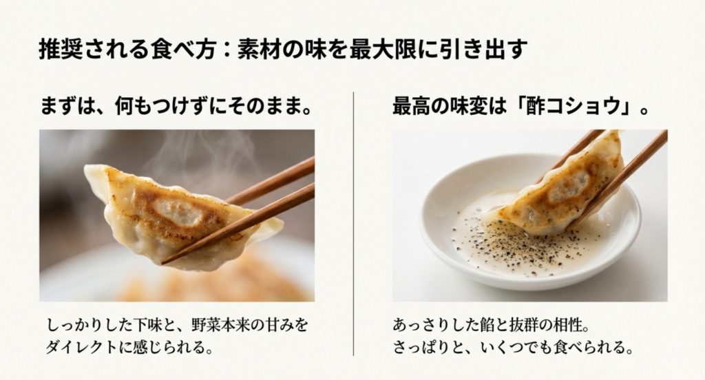 もちろん、定番の醤油+ラー油も合いますが、せっかくの無添加餃子なので、最初は薄味のタレで楽しむのが私のおすすめです。