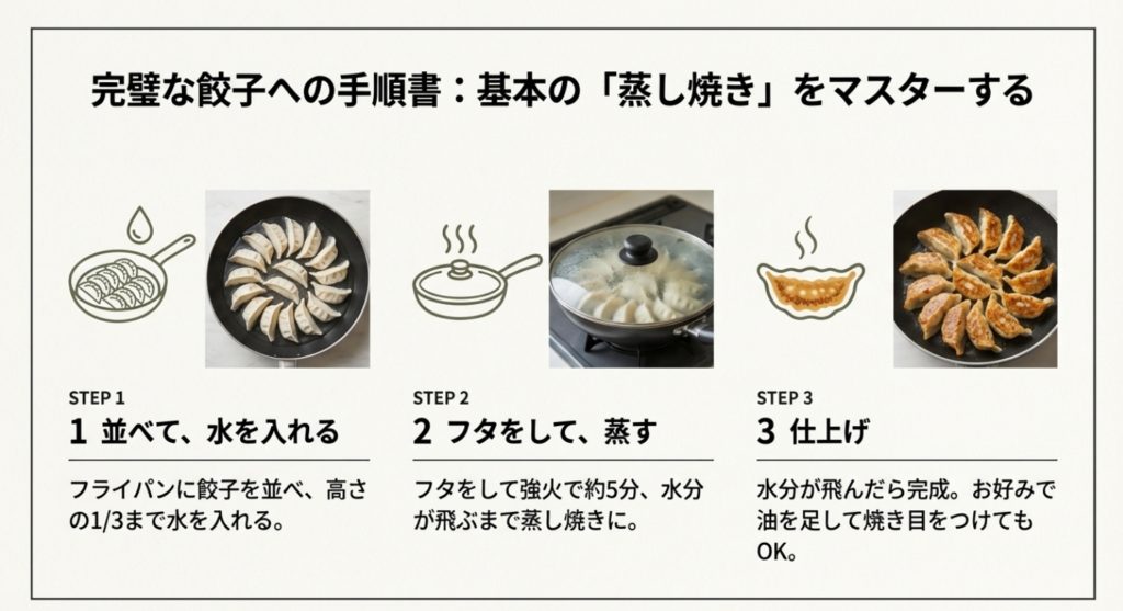 注意! 必ず「蒸し焼き」の工程を入れてください。フライパンに並べた後、餃子の高さの1/3くらいまで水を入れて、フタをして強火で蒸し上げるのが成功の鍵です。