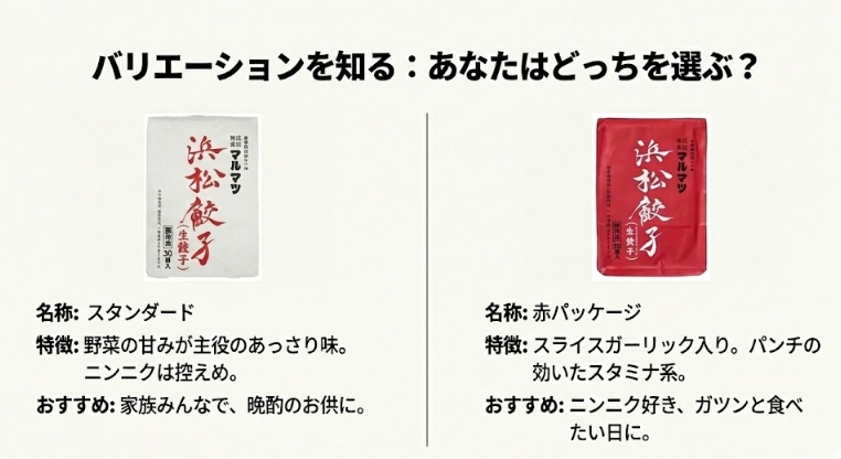 私が今回購入したのは、白いパッケージのスタンダードな「浜松餃子」ですが、売り場やネット通販を見ていると、他のバリエーションも存在することが分かります。
