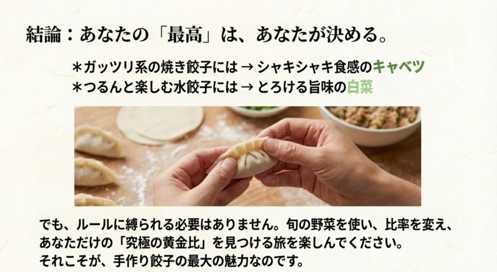 ぜひ、今度の餃子作りでは、いつもと違う方の野菜を試したり、ブレンドしてみたりして、あなただけの「究極の黄金比」を見つけてみてくださいね!