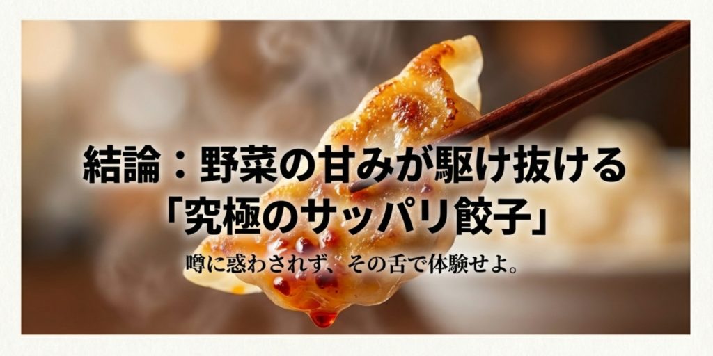 ここまで見てきた通り、「まさし餃子 まずい」という評判の多くは、味の好みや食べ方、店舗システムへの理解度によるギャップが原因でした。