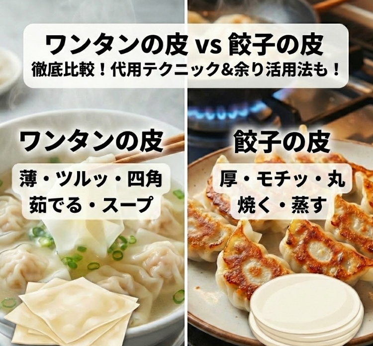 スーパーの棚で、ワンタンの皮と餃子の皮が並んでいるのを見て、ふと手が止まったことはありませんか。